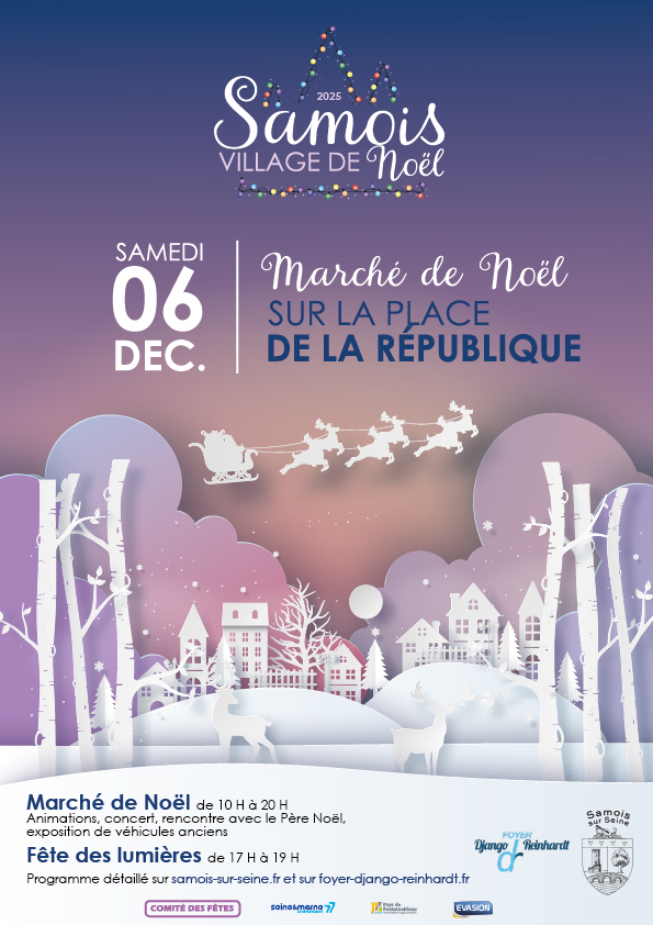 Le village de Noël revient à Samois-sur-Seine le samedi 6 décembre. Le comité des fêtes, l’association du Foyer Django Reinhardt et la municipalité vous donnent rendez-vous pour une journée féerique.